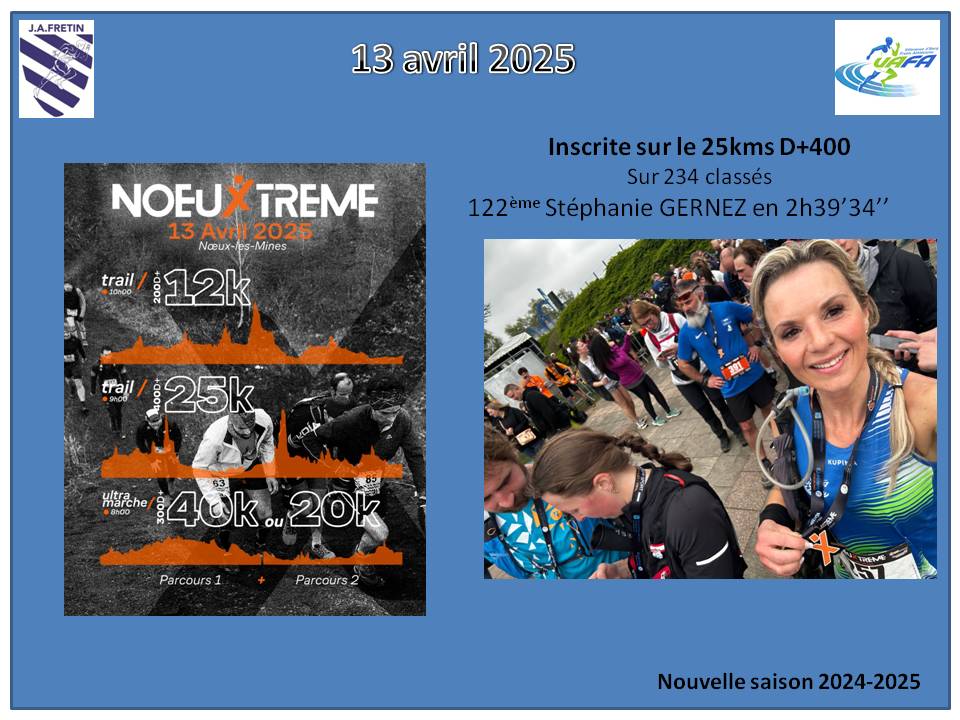 son commentaire : »Finisher de cette première édition du Noeuxtreme trail. Abordé en mode entraînement pour distance et deniv’ mais belle chûte arrière sur le tête 🤪au 19 ème kil (descente du tapis humide de la « piste de ski »). Pas certaine de renouveler l’expérience de ce trail 😅 »