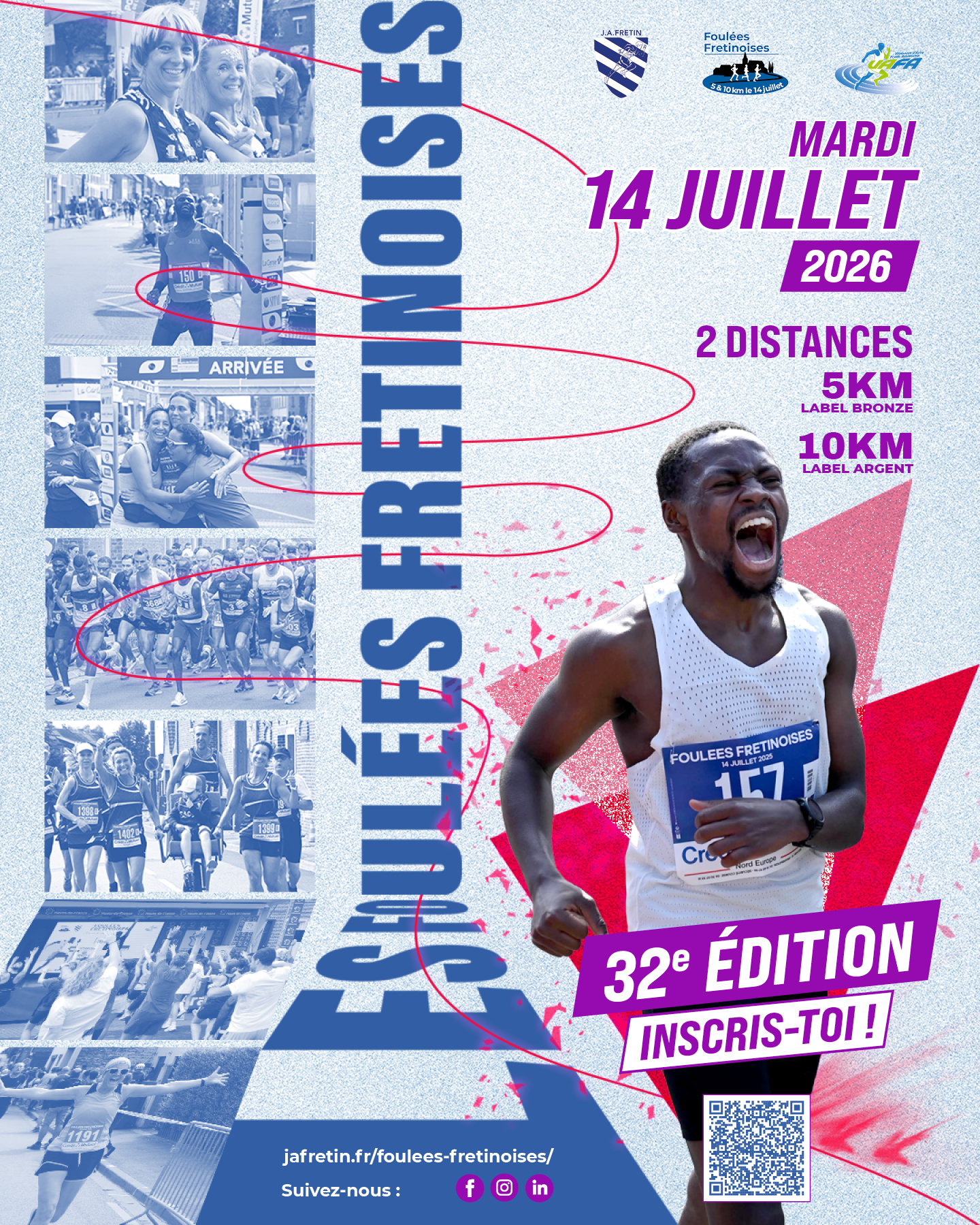 16e édition la Pévèle Trail : dimanche 9 novembre 2025 RESULTATS PEVELE TRAIL 2025 CLIQUEZ ICI 31e édition des Foulées ! ! Les Résultats ! Un représentant JAFiste aux Championnats d'Europe de Marche Nordique 2025 ! Stéphane en parfait représentant ! Les Records du club Suivez les derniers records du club ! De sacrées perfs dans la foulée du nouveau Record d'Europe ! Gérard s'en est allé Le club pleure le départ de son pilier fondateur... Toute l'Actu du JAF en 1 clic ICI ! NOS PRATIQUES ATHLETIQUES COURIR, SAUTER, LANCER, MARCHER LES CATEGORIES EN ATHLETISME Saison 2024-2025 NOS CRENEAUX HORAIRES Au Stade Nivesse de Fretin / A la Salle Chuffart de Fretin NOS EVENEMENTS Athlé Famille, Journées Nationales Marche Nordique & Hors stade, Foulées Fretinoises / Pévèle Trail Les Foulées Fretinoises : mardi 14 juillet 2026 ! Jour(s) : Heure(s) : Minute(s) : Seconde(s) INSCRIPTIONS A PARTIR DE DIMANCHE 8 FEVRIER 2026 A 18H00 CLIQUEZ ICI REGLEMENT DES FOULEES FRETINOISES 2026 CLIQUEZ ICI LES PARTENAIRES DU JA FRETIN